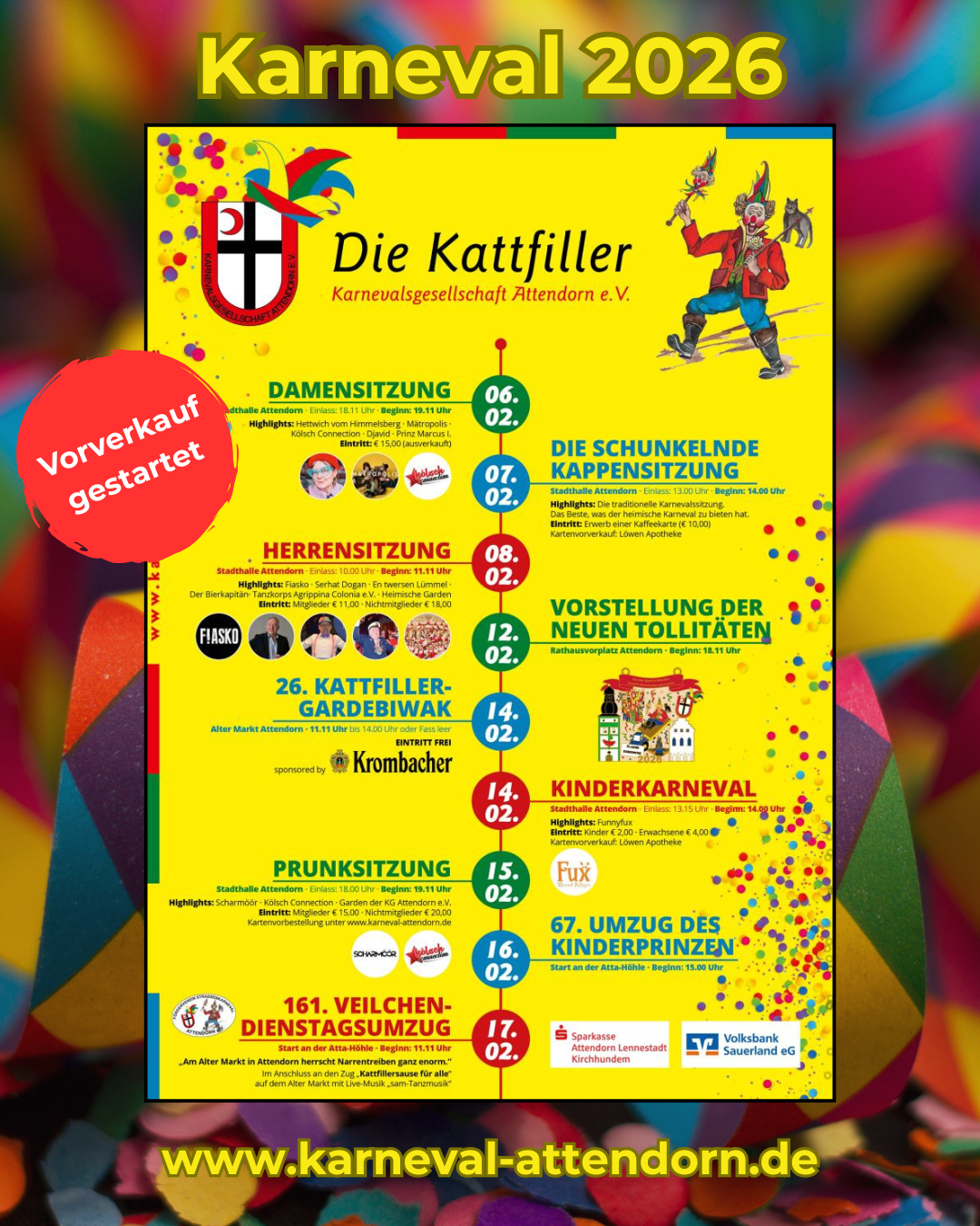 Hinzuweisen ist natürlich auch jetzt schon auf die Herrensitzung, mit der eine Woche vorher, am 8. Februar 2026 um 11:11 Uhr, ebenso in der Stadthalle Attendorn, die heiße Phase des Karnevals in Attendorn eingeläutet wird. Die Herren der Schöpfung sollten sich diesen Termin bereits jetzt vormerken.